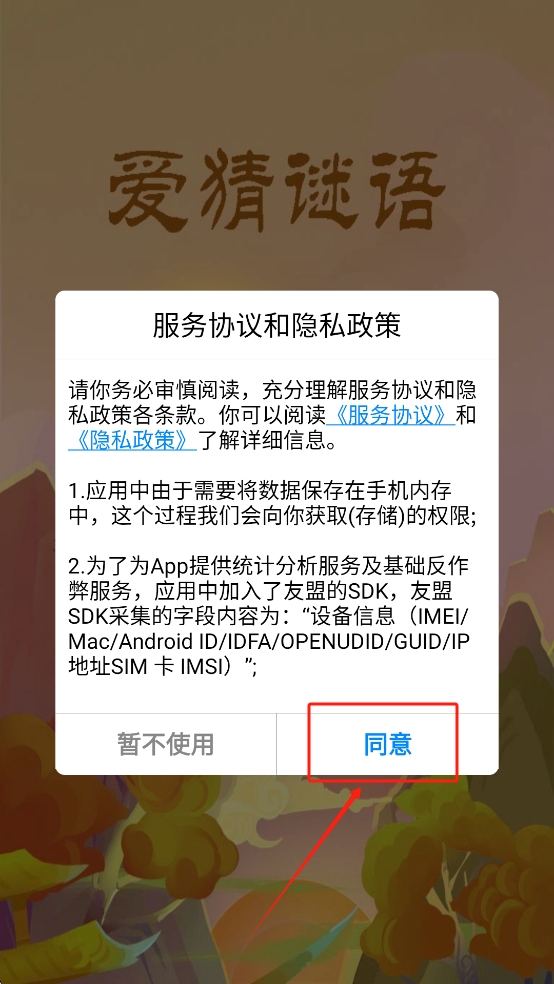 1、同意服务协议:在游戏启动时,点击“同意”按钮以接受服务协议和隐私政策。