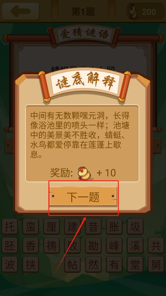 4、进入下一题:成功解答谜语后,点击“下一题”按钮继续进行下一个谜语挑战。