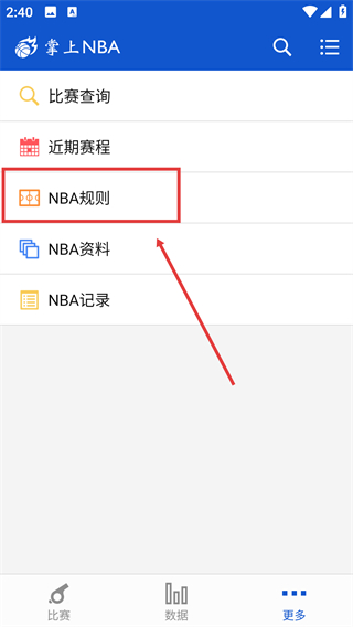2、展开功能列表后,选择【NBA规则】选项,即可进入规则详情页面,查看各类赛事规则说明。
