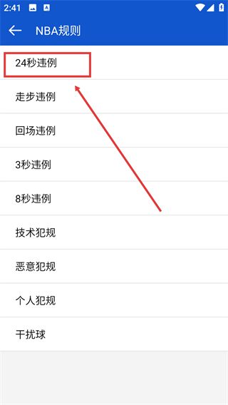 3、进入【NBA规则】页面后,点击【24秒违例】选项,可查看该违例的具体判定标准与情况说明。