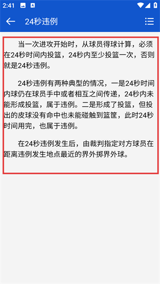 4、查看【24秒违例】的说明内容,能了解其进攻计时要求、违例情形及违例后的判罚方式。