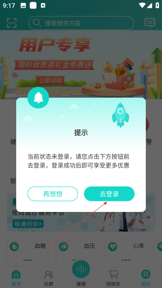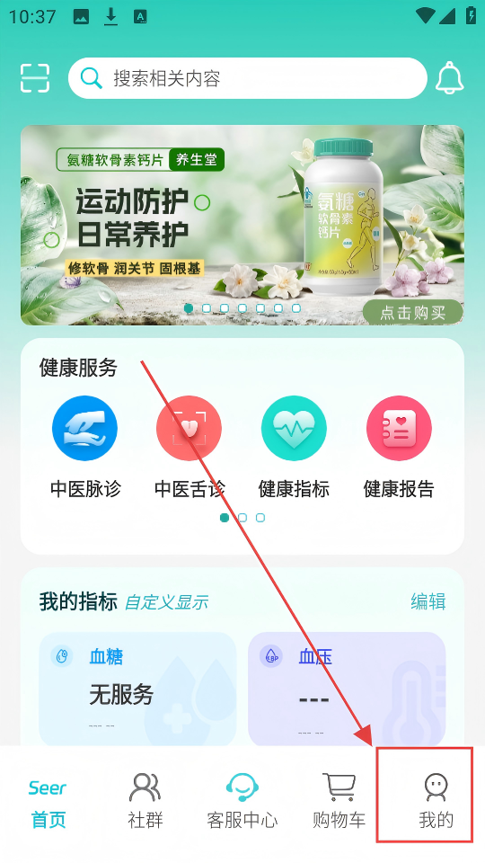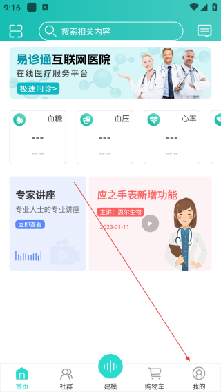 1、在健康服务类应用首页,点击右下角【我的】,进入个人中心页面啦。