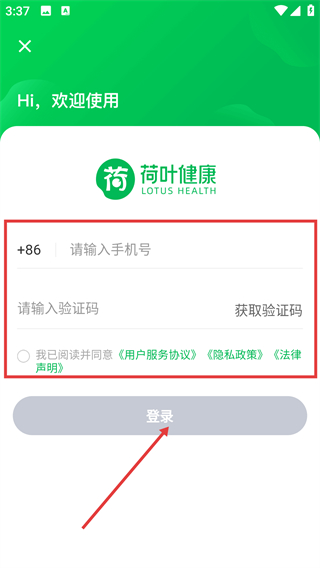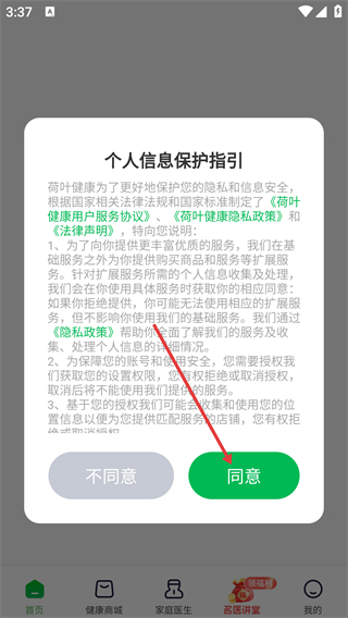 1、打开荷叶健康后,阅读《荷叶健康隐私政策》《用户服务协议》,点击【同意】,即可使用软件服务。