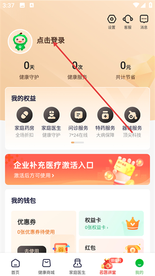 2、进入软件首页后,点击底部【我的】,可进入个人页面,查看健康守护、我的钱包等功能。