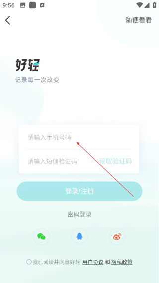 1、打开好轻体重控制减肥瘦身,点击【请输入手机号】。