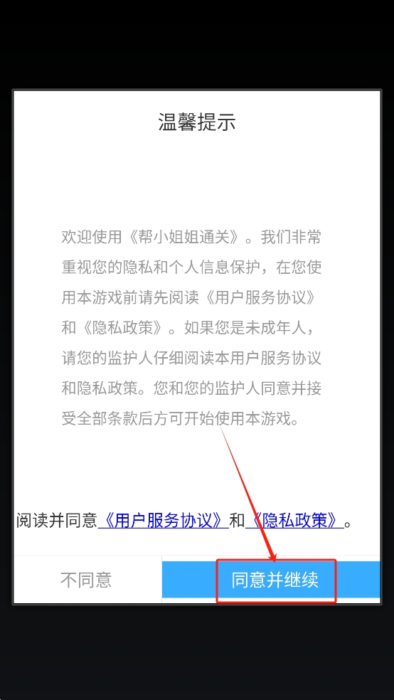 1、同意并继续:在游戏启动时,点击“同意并继续”按钮以接受用户服务协议和隐私政策。