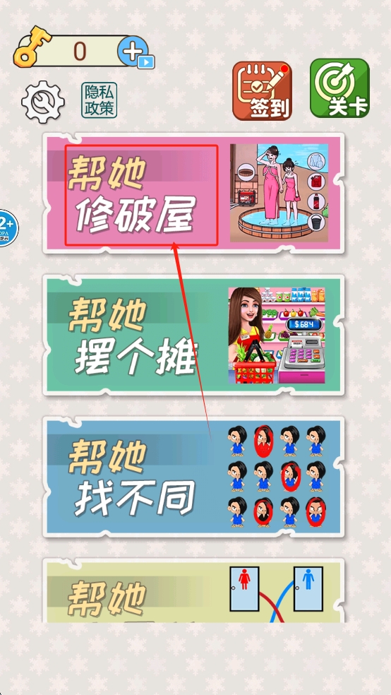 2、选择关卡:在游戏主界面,点击选择“帮她修破屋”等不同关卡开始游戏。