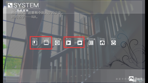 3、善用系统菜单功能,通过【Save】【Load】管理存档,利用【Auto】【Skip】控制对话播放节奏,提升游戏体验。