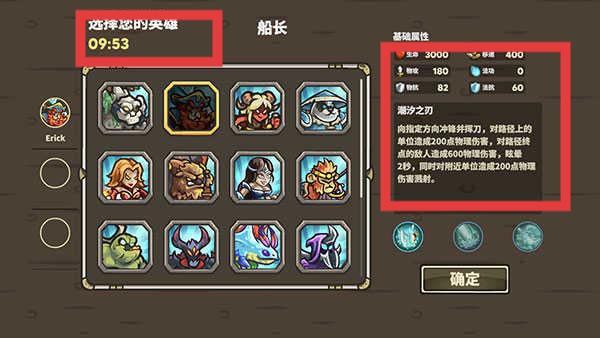1、在【选择您的英雄】界面,查看英雄基础属性及技能(如船长的【潮汐之刃】对路径上单位造成物理伤害并眩晕),根据喜好选择英雄。