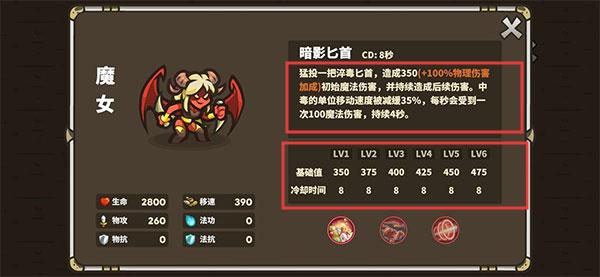 2、了解英雄技能详情,如【魔女】的【暗影匕首】CD8秒,基础值随等级提升,冷却时间固定,升级可增强伤害,战斗中注意技能释放时机。
