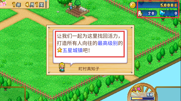1、游戏目标是打造最高级别的★五星城镇,留意屏幕上方资源(金币5000G等),合理规划使用。