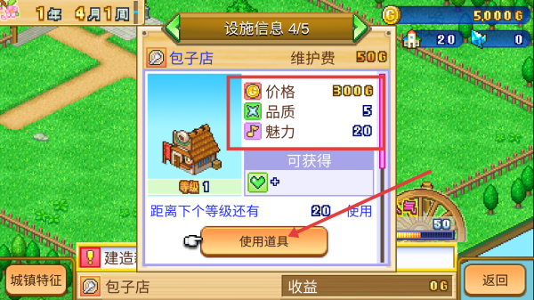 2、建设设施(如包子店),关注【价格】【品质】属性,通过【使用道具】提升设施等级,增加城镇吸引力与收益,同时注意维护费。