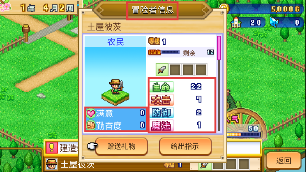 3、查看【冒险者信息】,了解【生命】【攻击】等属性,通过【赠送礼物】或【给出指示】提升【满意】度与【勤奋度】。