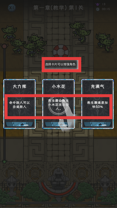 2、面对敌人时,通过【选择卡片】增强角色能力。如“大力挥”命中敌人可击退,根据战况选择合适卡片。