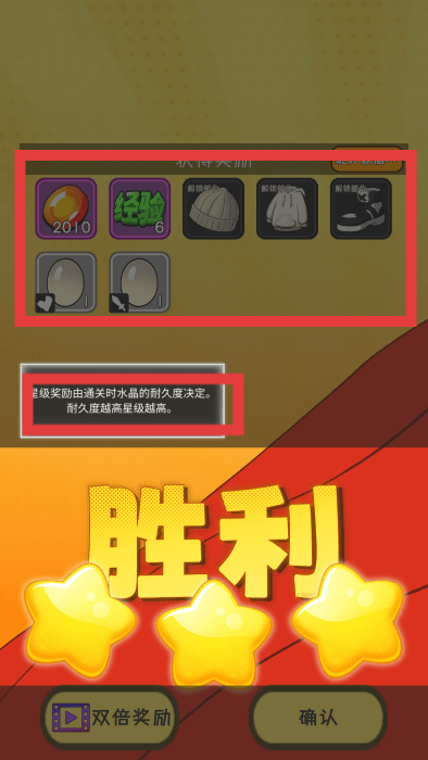 3、通关后,【星级奖励由水晶耐久度决定】,耐久度越高星级越高。获取奖励包括经验、道具等,尽量争取更高星级奖励。