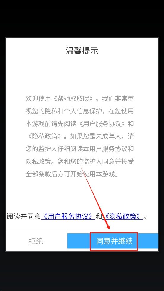 1、同意用户协议:在游戏启动时,阅读并点击“同意并继续”以接受用户服务协议和隐私政策,开始游戏。
