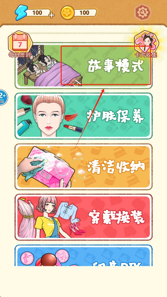 2、选择游戏模式:在游戏主界面,选择不同的游戏模式,如“故事模式”、“护肤保养”、“清洁收纳”,进入相应的游戏环节。