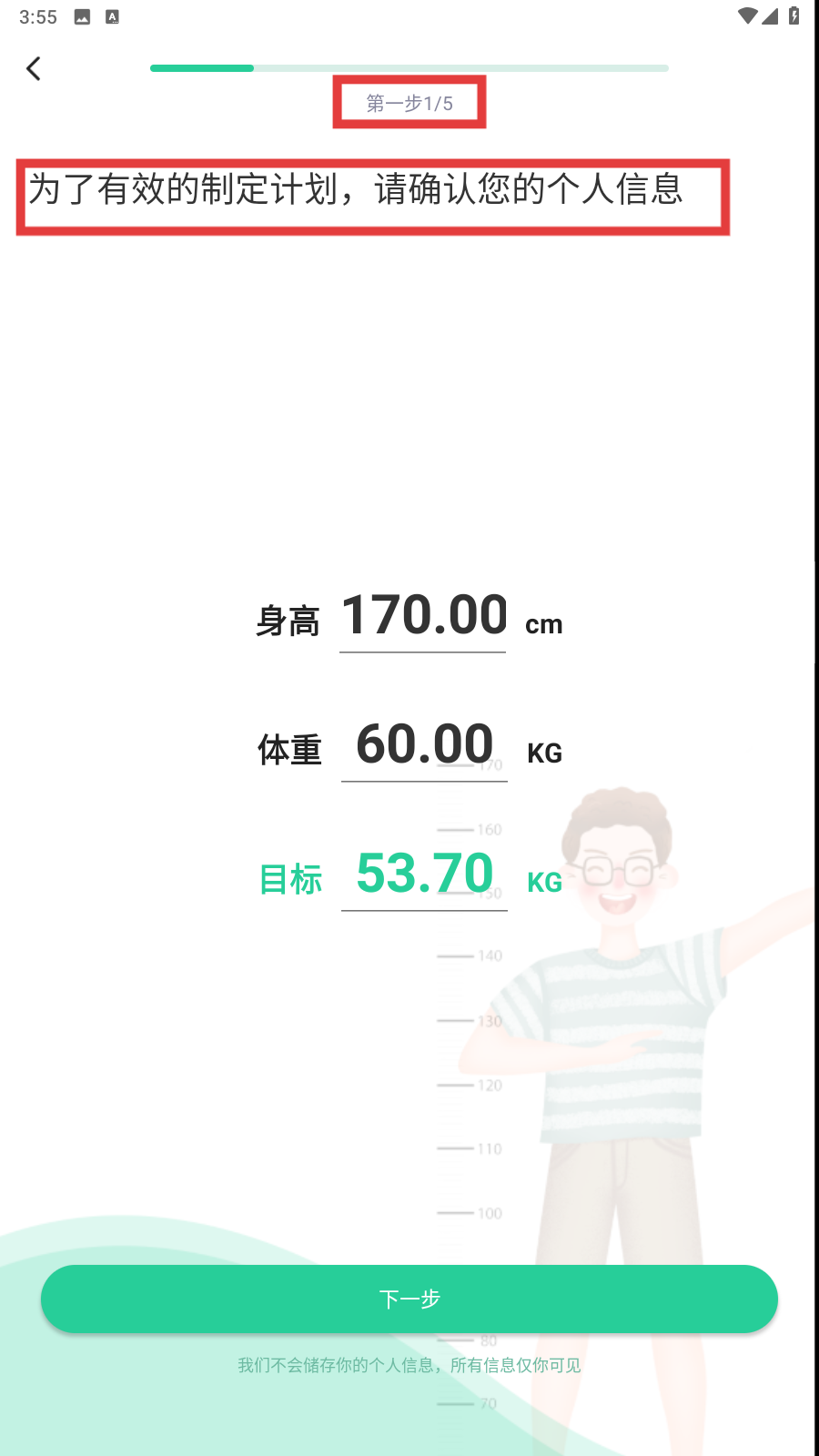 1、【为了有效的制定计划,请确认您的个人信息】,输入身高、体重等数据,确认后进入下一步。
