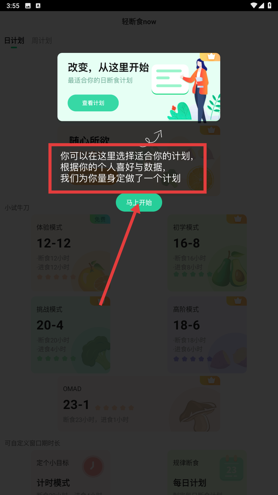 2、【你可以在这里选择适合你的计划,根据你的个人喜好与数据,我们为你量身定做了一个计划】,点击【马上开始】开启轻断食计划。