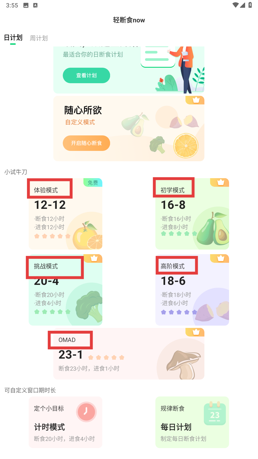 3、根据需求选择【体验模式】【初学模式】【挑战模式】【高阶模式】或【OMAD】等轻断食模式,按对应模式进行断食与进食。