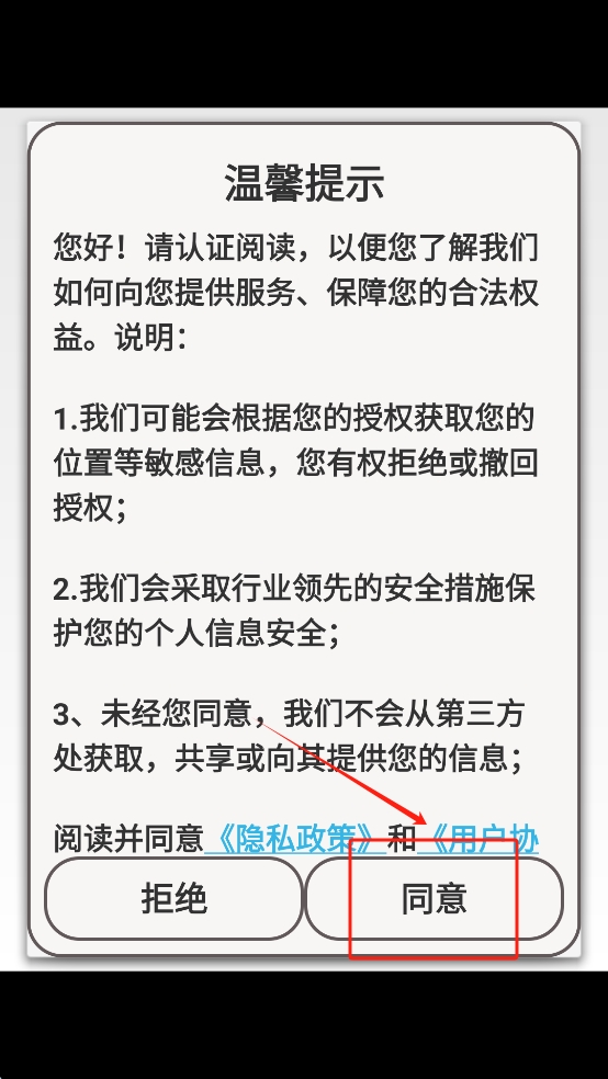 1、同意隐私提示:在游戏启动时,阅读并点击“同意”按钮以接受隐私政策,从而开始游戏。