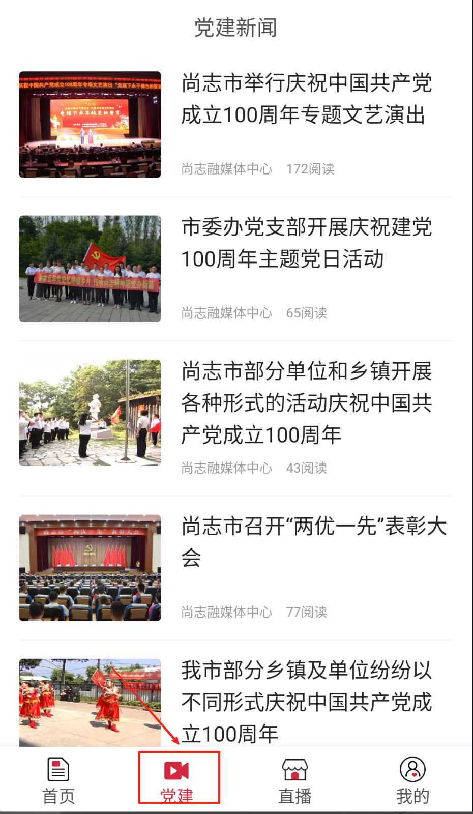2、要看党建新闻就去底部导航栏点"党建"图标,置顶的红色专题都是重要活动,像建党纪念演出这种带阅读量数字的更值得先看。