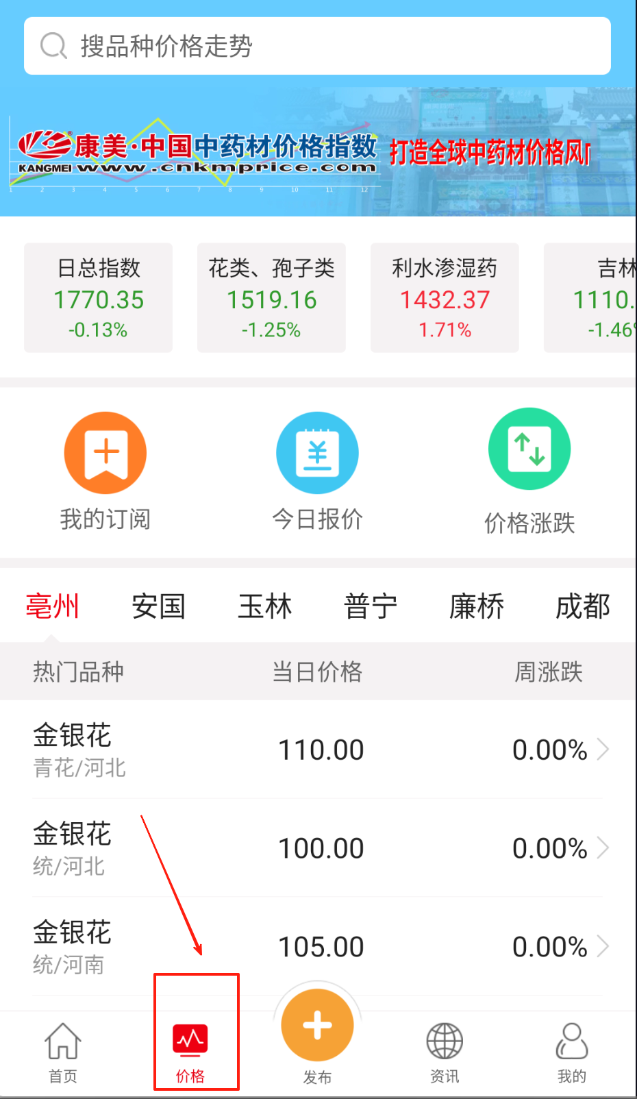 2、进入价格指数界面选择药材品类查看全国主要交易市场的实时报价曲线,点击订阅按钮可设置价格异动提醒功能。