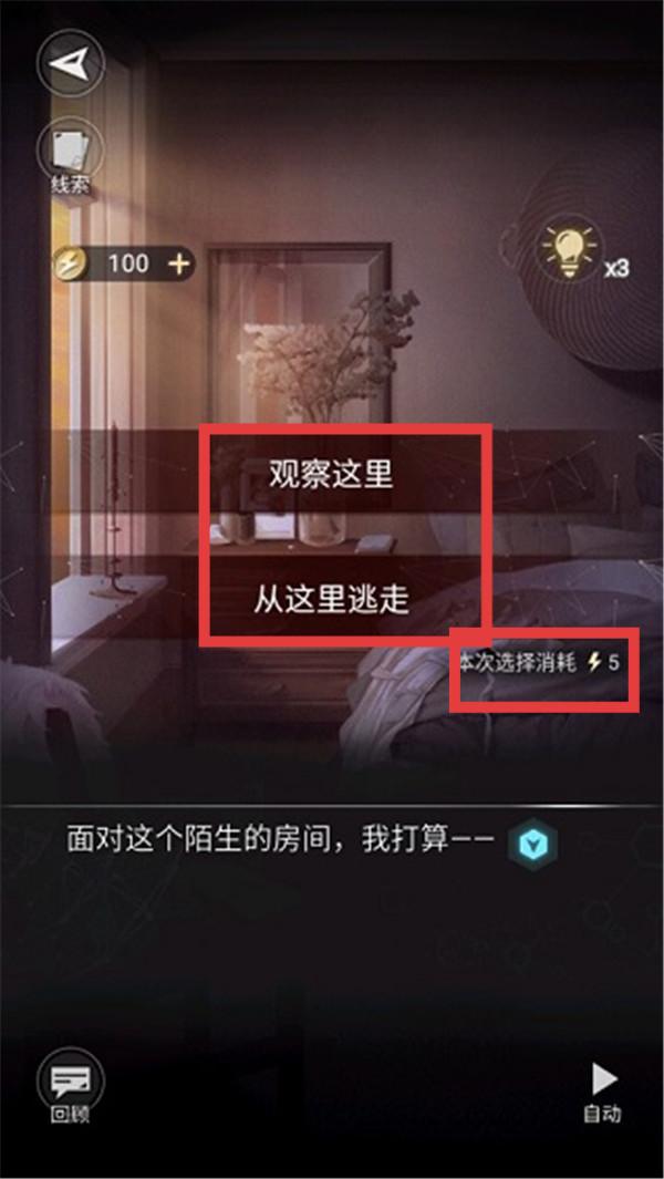 2、面对陌生场景时根据选项抉择,如【观察这里】或【从这里逃走】,同时留意选择消耗提示。