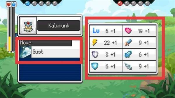 1、关注角色属性面板,如【Kalumunk】的【Lv】【生命】及各项数值提升,了解角色成长情况,合理安排技能如【Move】【Gust】。