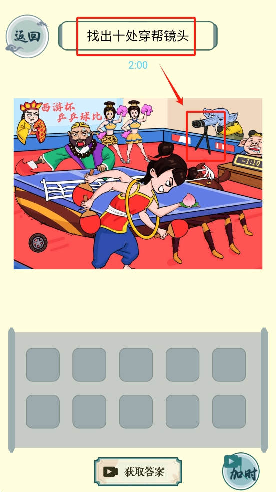 4、进行游戏挑战:在游戏过程中,根据提示找出图中的穿帮镜头,例如找出乒乓球比赛中的摄像机穿帮镜头。