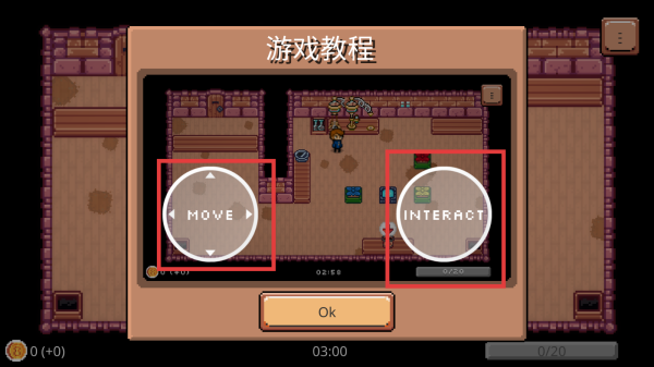1、熟悉基础操作,通过左侧【MOVE】摇杆控制角色移动,右侧【INTERACT】按钮与场景中的物品或角色交互。