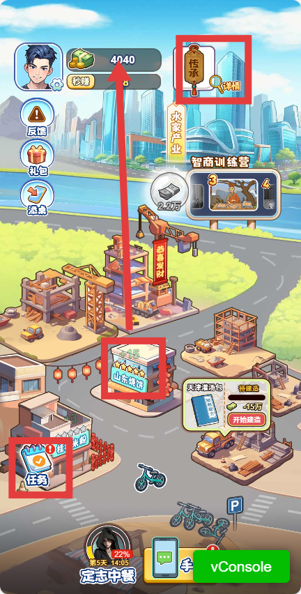 3、在经营建设界面,点击【任务】查看目标,通过建造【山东烧烤】等建筑,完成【传承】等产业相关任务,提升游戏收益和等级。