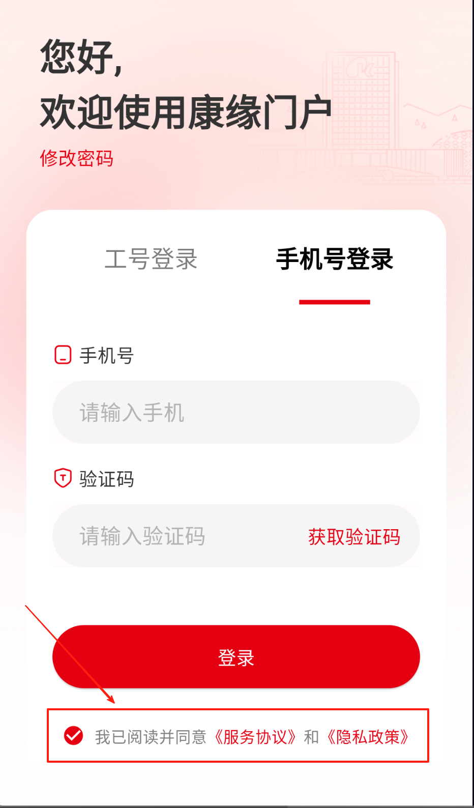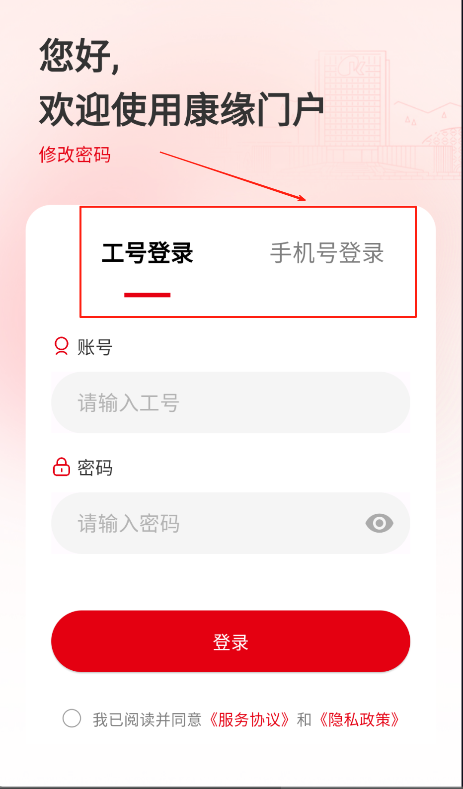 1、打开应用选择登录方式,点击顶部导航栏切换工号或手机号登录,输入框会对应显示账号类型需要填写的内容,记得核对后再输入。