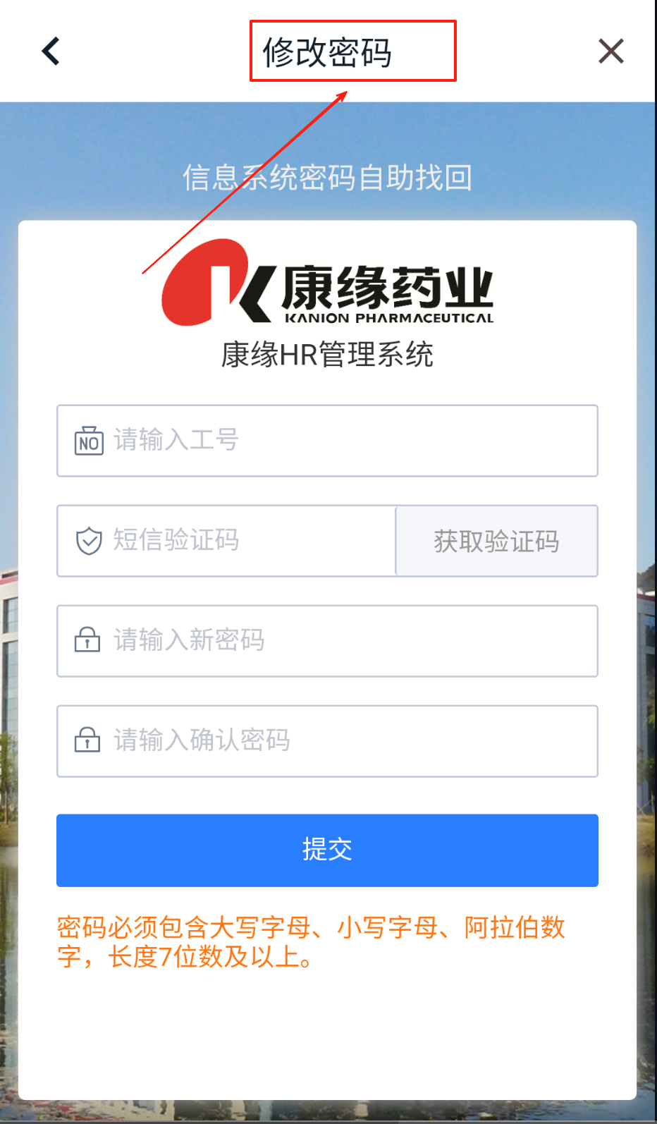 3、修改密码需进入专属页面,依次填写工号获取短信验证码,新密码要包含大小写字母和数字组合,确认无误后点击蓝色提交按钮生效。