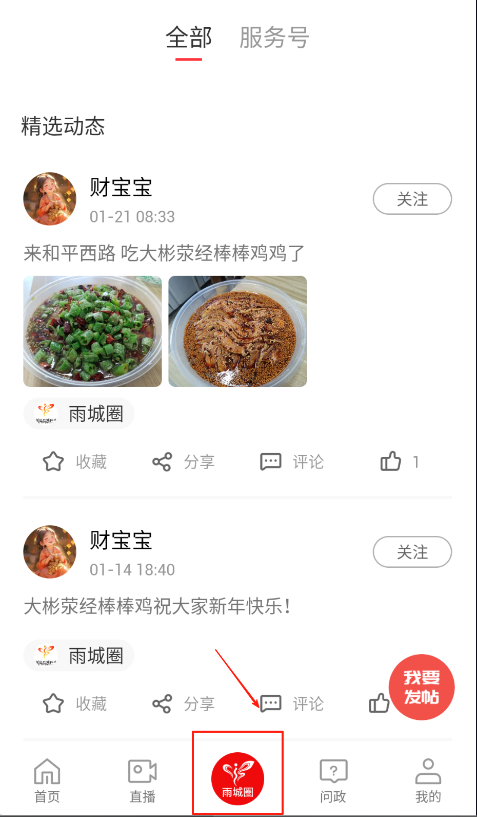 3、雨城圈模块支持九宫格图文混排发布,长按网友动态可触发点赞评论,特产商城接入LBS定位推荐周边农副产品。