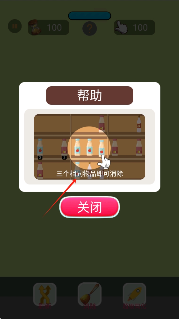 1、了解游戏的基本规则,图中显示了游戏的帮助提示,三个相同的物品即可消除,点击关闭按钮继续游戏。