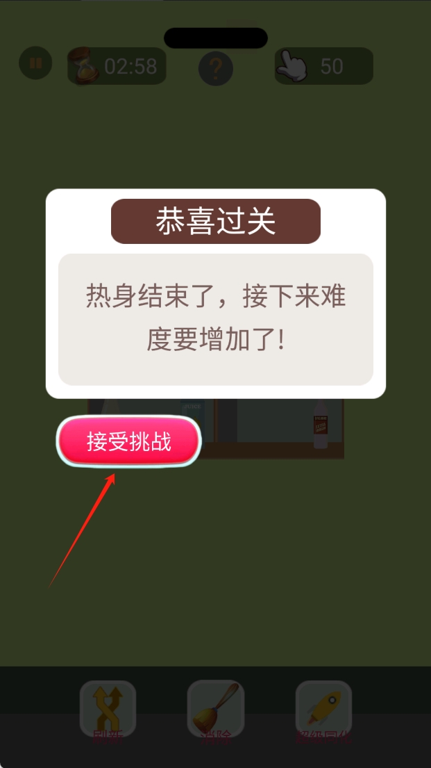 2、掌握游戏的胜利条件,图中显示了过关提示,热身结束,接下来难度增加,点击接受挑战进入下一关。