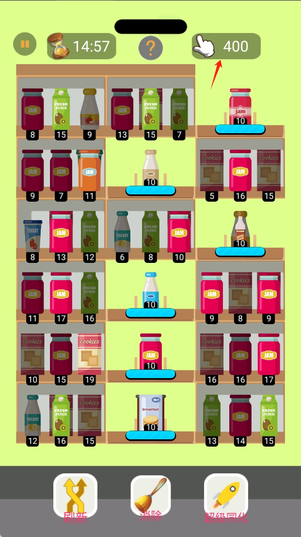 4、动态补给,新货品会随机补充,灵活组合新旧物品能提升消除效率。