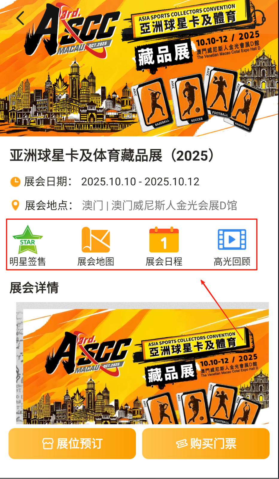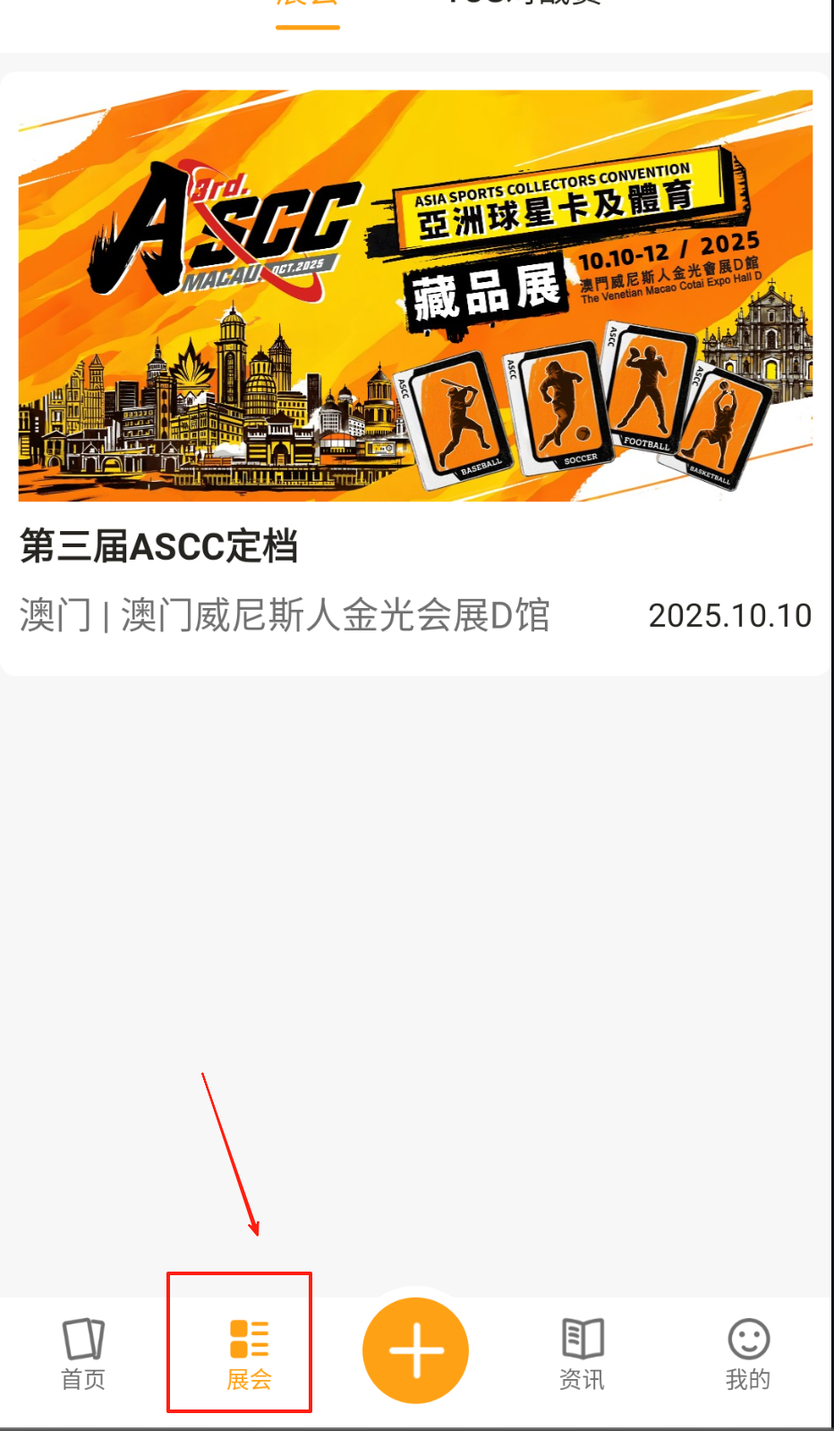 1、点击底部“展会”图标进入主会场,滑动浏览东南亚球星卡展等最新资讯,还能查看展会时间地点呢。