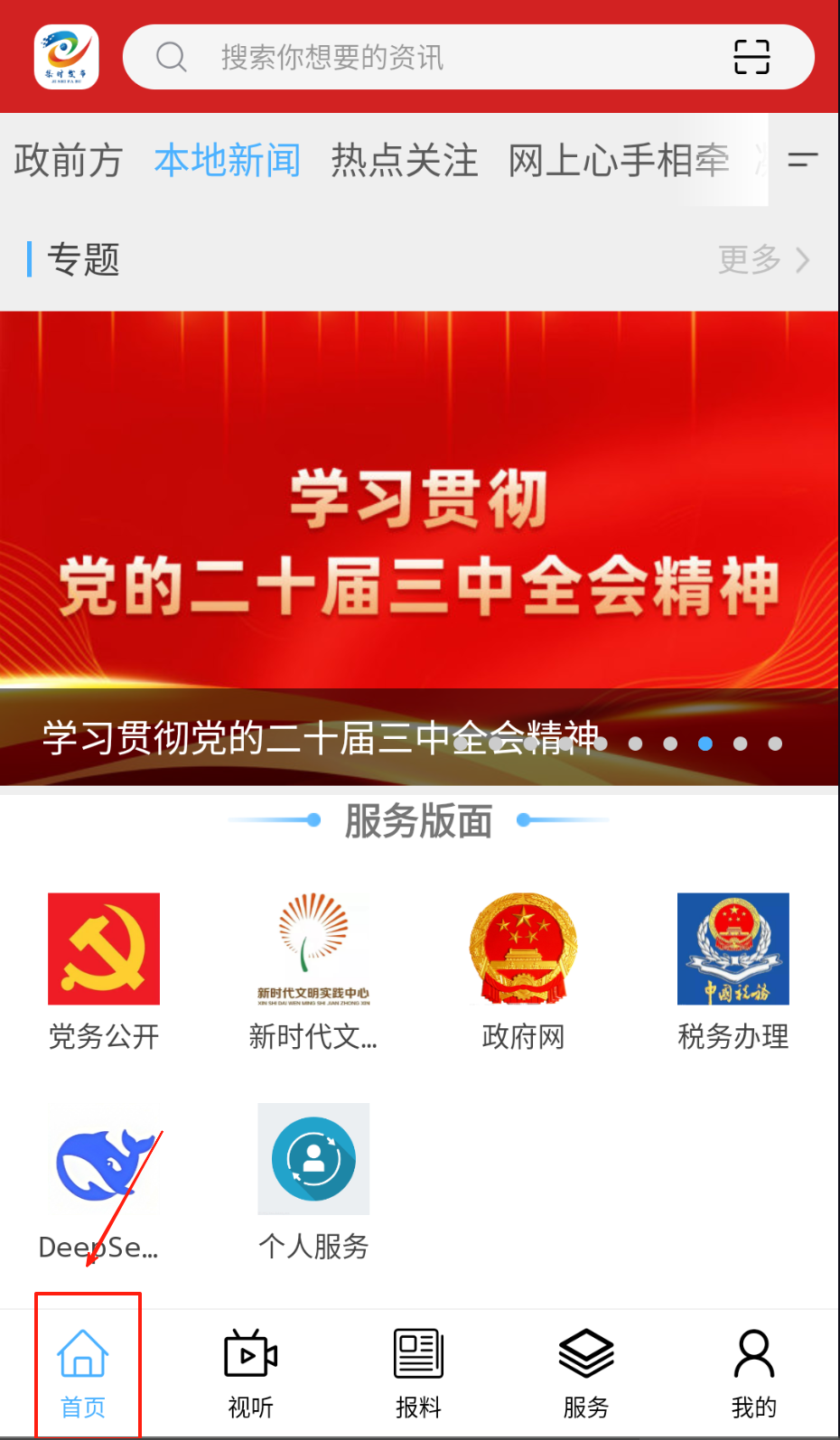 2、通过顶部搜索栏输入关键词查找特定资讯,或进入视听中心观看带解说视频报道。