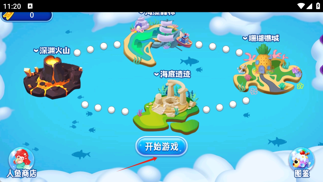 1 、选择开始游戏进入主界面,点击开始游戏按钮,选择不同的海洋场景开始探险之旅。