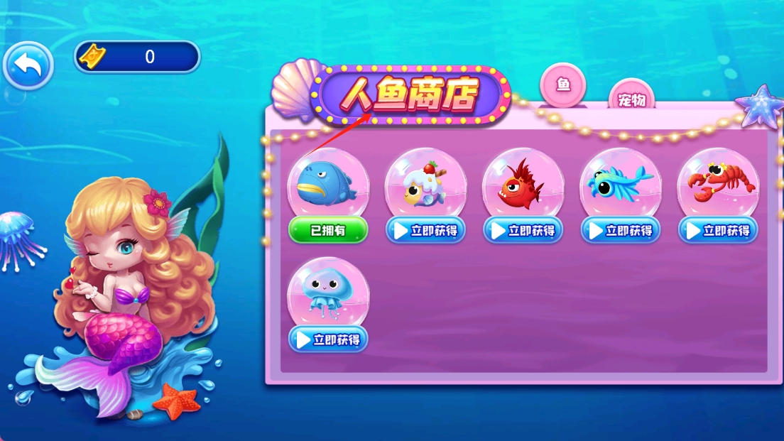 2、在人鱼商店中,可以购买和收集各种海洋生物,点击人鱼商店查看可购买的鱼和宠物。
