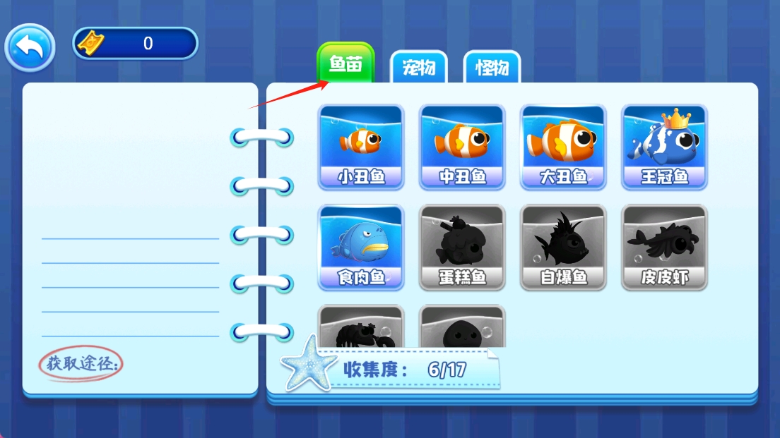 3、图鉴中记录了已收集和待收集的海洋生物,点击鱼苗查看收集进度和获取途径,完善图鉴。