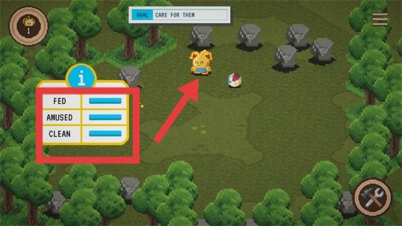 1、关注屏幕左侧状态条,通过满足【FED】(喂食)、【AMUSED】(逗乐)、【CLEAN】(清洁)需求,照顾好角色。