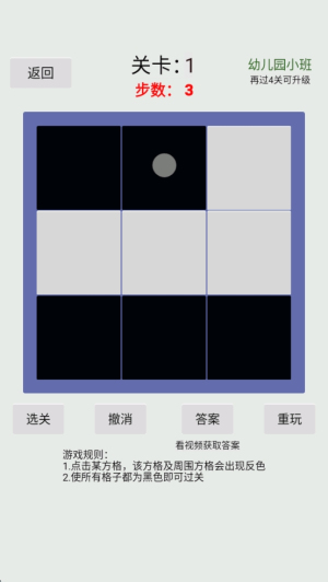 3、完成关卡:成功将所有方格变为黑色后,点击“下一关”按钮以继续游戏或进入下一关。