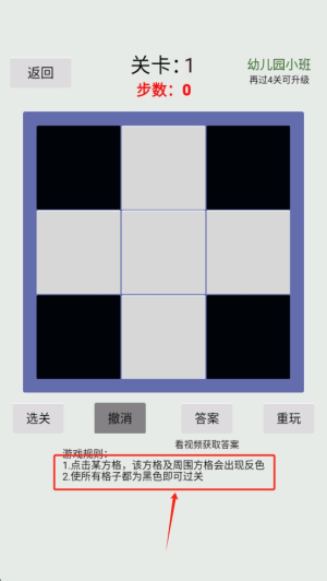 2、游戏操作:在游戏界面中,根据游戏规则点击方格,使周围方格变色,目标是将所有方格变为黑色。