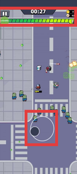 1、在战斗场景中操纵场景中的【圆圈区域】的操纵杆,灵活走位躲避僵尸攻击。