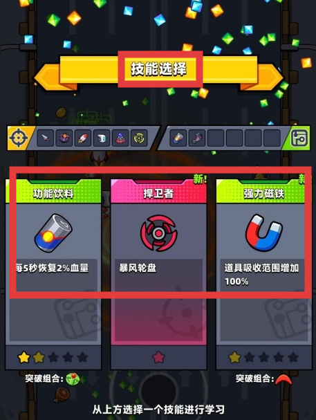 2、在技能选择界面,根据战斗需求选择技能,若需续航可选【功能饮料】,若需增强清怪能力可选【暴风轮盘】。