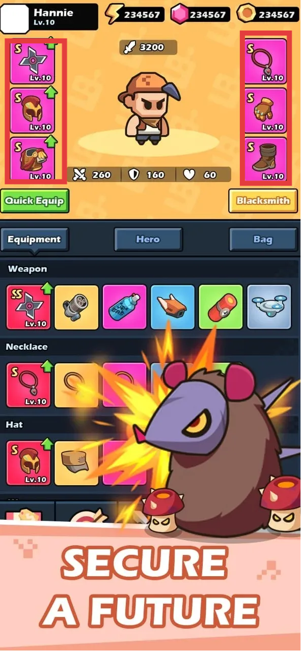3、注重角色装备培养,将武器、项链、帽子等装备提升至较高等级(如Lv.10),提升角色如攻击、防御、血量等属性,增强角色战斗力。