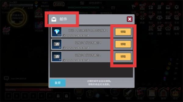 1、在游戏中,定期查看【邮件】系统,及时点击【领取】按钮获取奖励。